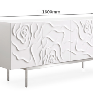 لن تكتمل ديكورات منزلك بدون هذه القطعة الفاخرة . كونسول من الخشب بلون ابيض أنيق مع ادراج بنقش فريد من نوعه , تتميز بقواعد ستانلس ستيل فضي و طلاء لامع