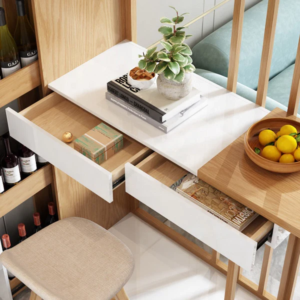 تتميز الكوفي كورنر بخاصية الطي وبشكل هندسي مبتكر مع أرفف جانبية بتصميم شيك . وتتميز بلمسة نهائية محايدة تنسق مع أي ديكور تقريبًا ، كما أنها مصنوعة من خشب الزان والام دي اف والأرجل الصلبة لتكمل البنية القوية إلى جانب تصميم ممتع.