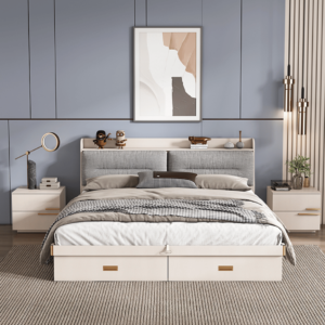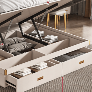 الخامات الرئيسية : مصنوعة من الخشب الهندسي المتين مع قواعد من الستيل المذهب الصلب والمعادن المتينة المقاومة للصدأ وتتميز بأدراج كبيرة بمساحات تخزين ممتازة ومغطاة ظهر السرير ومقعد السراحة من القماش المخملي الرائع والناعم والمبطن بالاسفنج عالي الكثافة