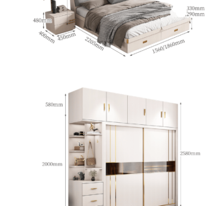 اقتني هذه الغرفة المكونة من سرير مع 2 كومود وخزانة ملابس وسراحة مع مرأة ومقعد وخزانة جانبية لإضفاء لمسة لغرفة النوم . يمكنك تنظيفه بمسحة رقيقة فقط عند الحاجة.