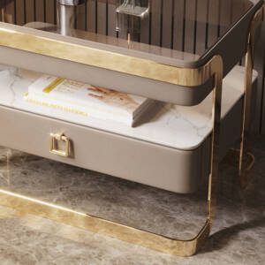 الخامات الرئيسية : مصنوعة من الخشب الهندسي المتين بقاعدة من الستيل الصلب المذهب مبطنة بالجلد الفخم مع زجاج مموه