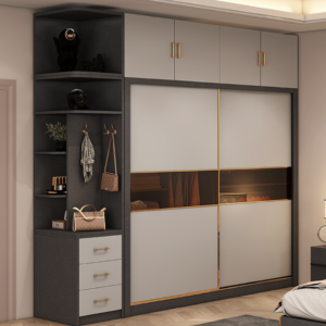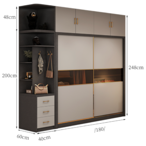 لا يحتاج تصميم الباب المنزلق إلى توفير مساحة مفتوحة ، فهو أكثر ملاءمة لاختيار المساحة الصغيرة ، تخزين علوي اضافي ، خزانه جانبيه مع أرفف للاحتياجات اليومية