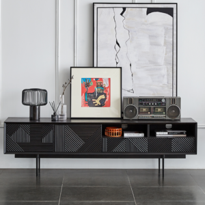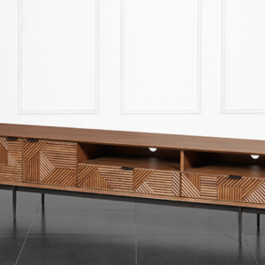 أضيفي لمسة من الأناقة الى غرفة معيشتك مع هذه الطاولة الرائعة . طاولة تلفاز بتصميم EVITA , مصنوعة من خشب صلب و قاعدة معدنية باللون اسود